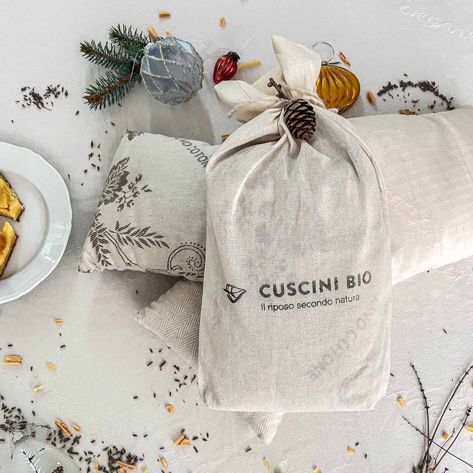Il profumo delicato della lavanda ha un impatto rilassante sul corpo e può contribuire a migliorare il sonno. I cuscini e il tessuto in cotone bio e lino sono realizzati utilizzando lo sfrido dei materiali che utilizziamo per la produzione di cuscini e biancheria. È un prodotto naturale ed ecosostenibile.